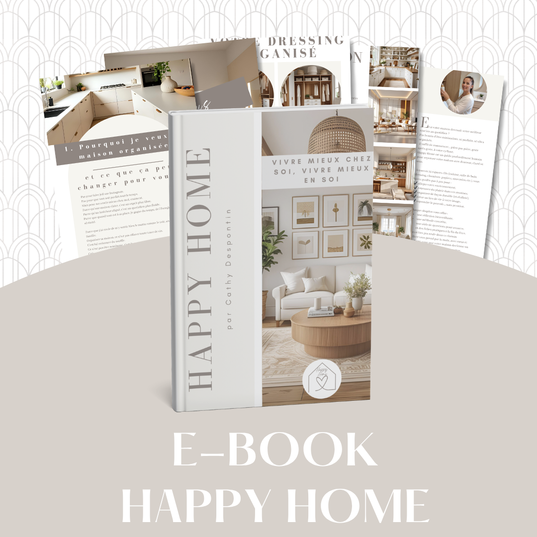 Happy Home est un ebook pratique et inspirant de 115 pages pour vous aider à transformer votre maison pièce par pièce, avec douceur, méthode et sans pression.